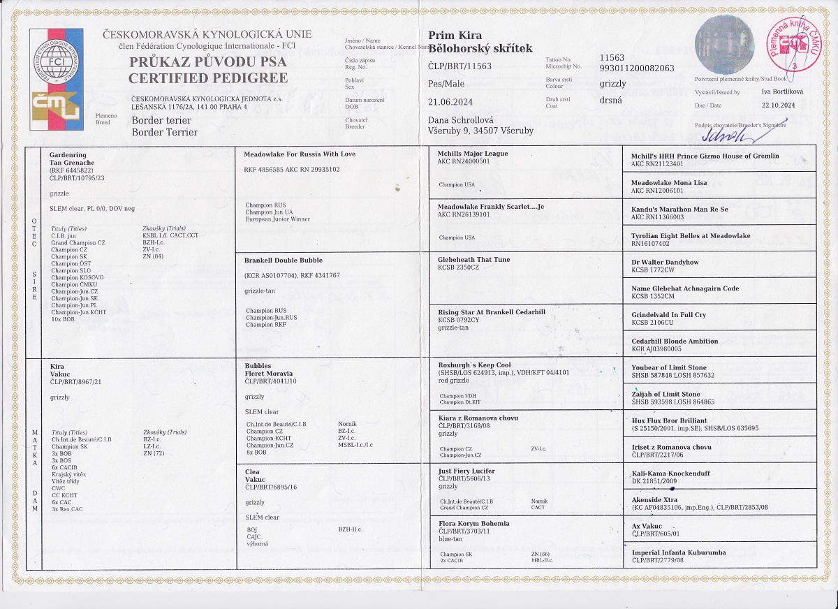 | 20.09.2025 | Mezinárodní (CACIB) Klatovy/ | Miroslav Václavík/CZ | mladých | V1, CAJC, BOJ /6 b. |